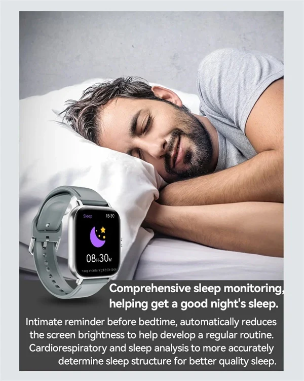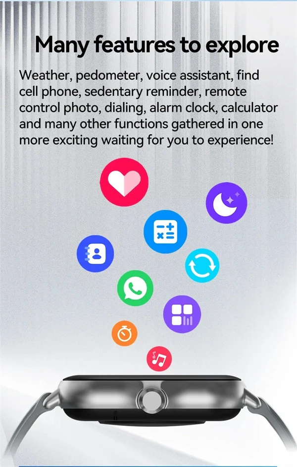 Custom wallpaper, Bluetooth call, music control, social APP message reminder, incoming call reminder, SMS reminder, multi exercise, alarm clock reminder, sedentary reminder, search for mobile phone, music playback, stopwatch, step counting, distance, calories, sleep monitoring, heart rate Monitoring, blood pressure, blood oxygen, searching equipment, language switching, and raising your hand to brighten the screen.