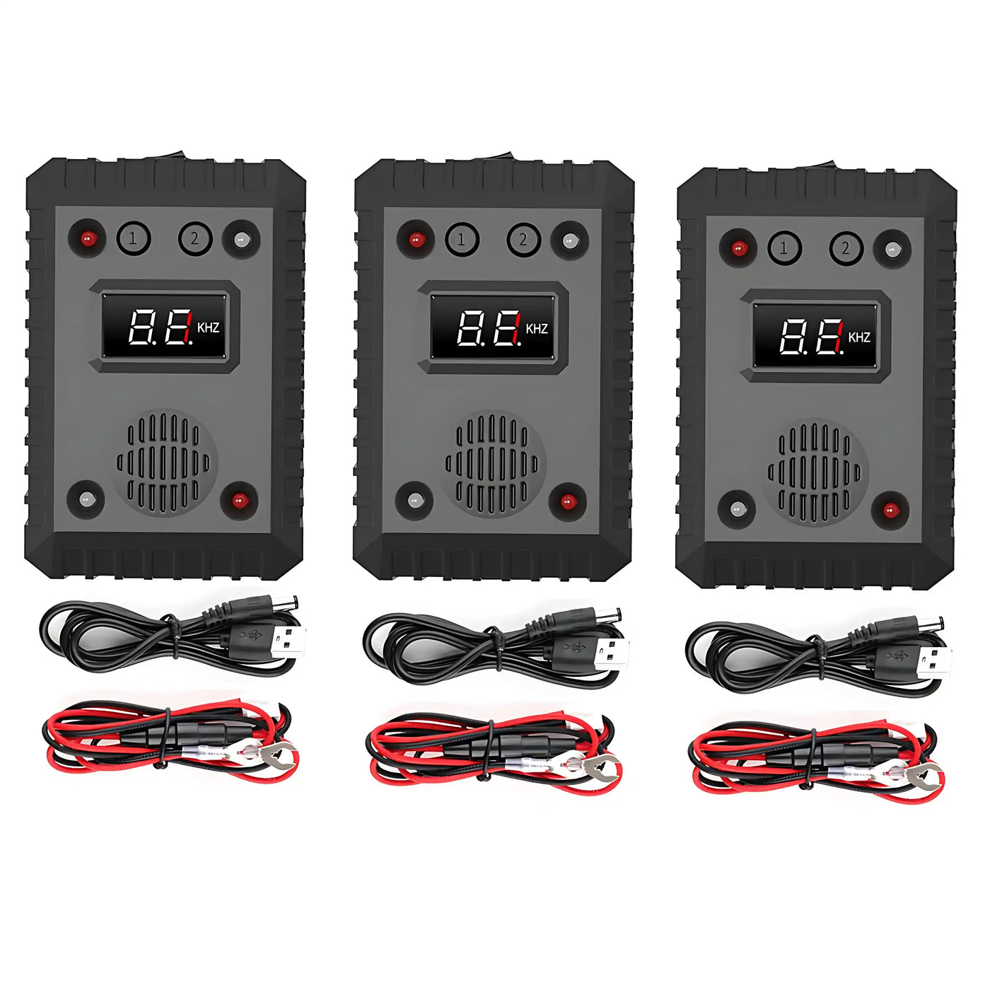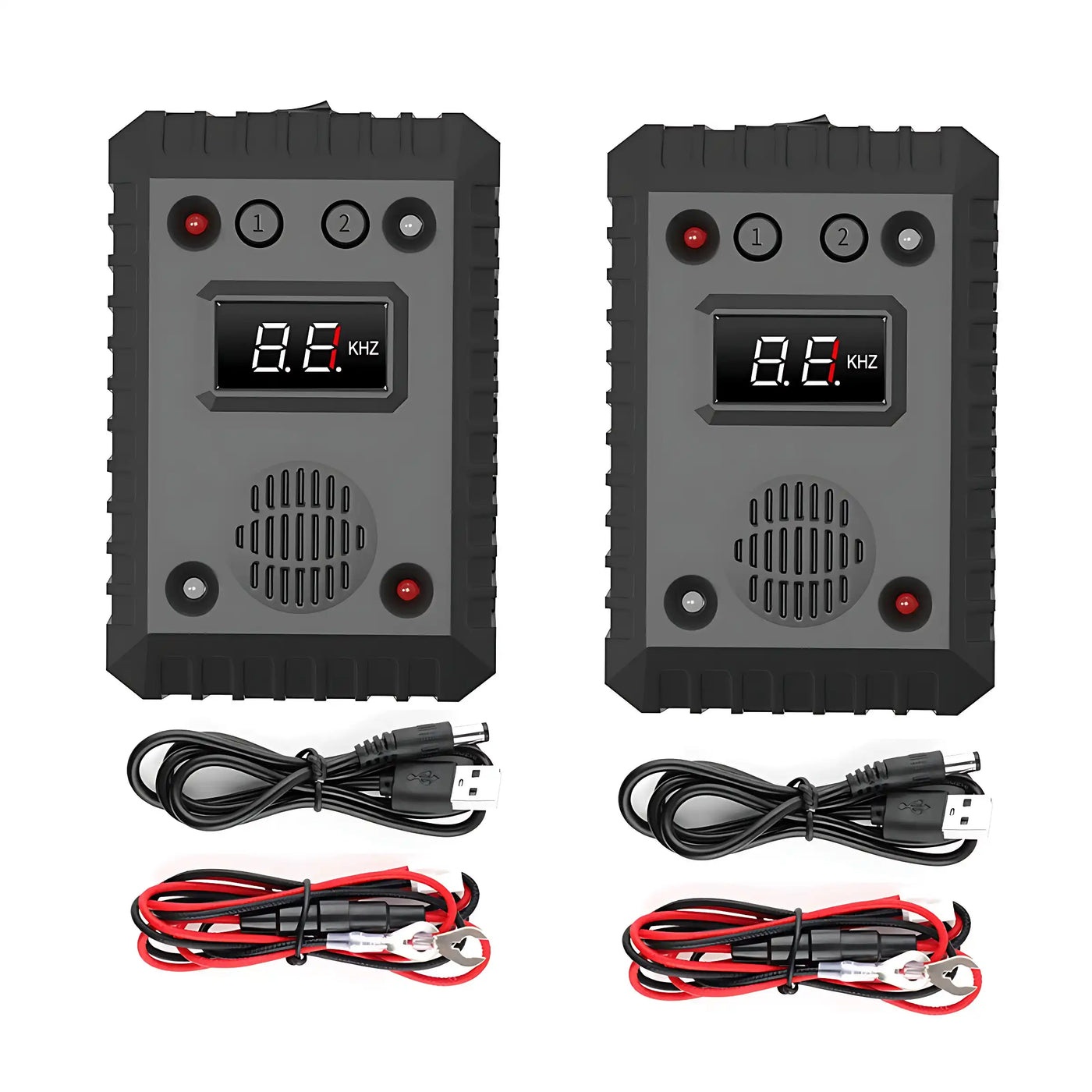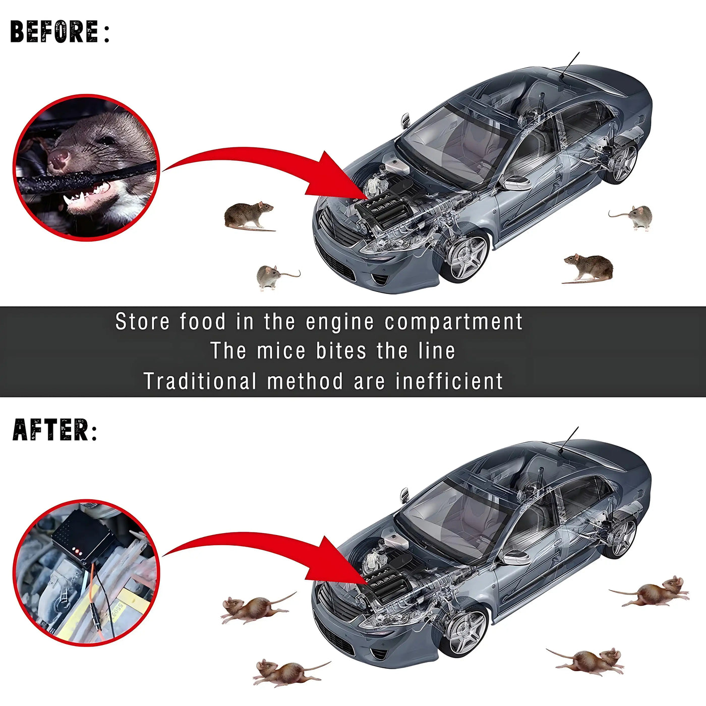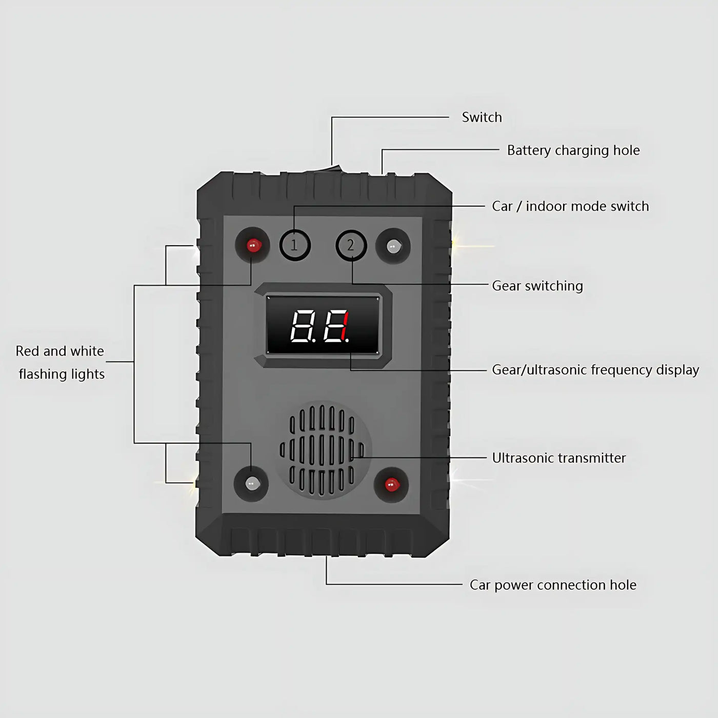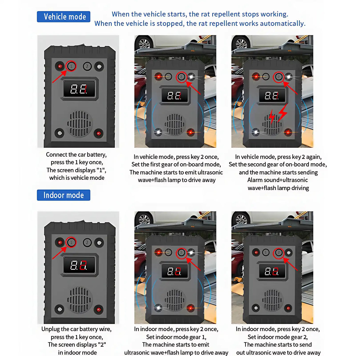 Car Mode: Auto-starts when engine stops (26-65kHz ultrasound + LEDs). Add alarm sounds in Gear 2 for stubborn pests.