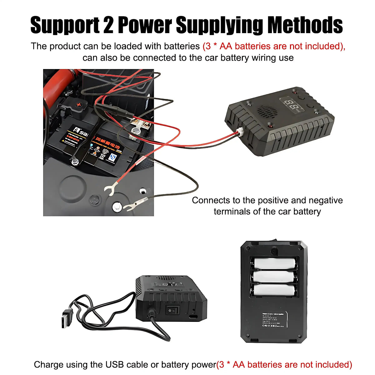 Power Source: 12-24V (car battery) / 5V (USB)