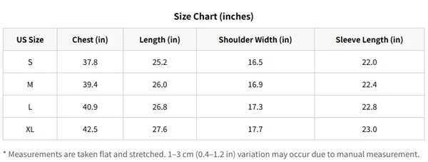 * Measurements are taken flat and stretched. 1–3 cm (0.4–1.2 in) variation may occur due to manual measurement.