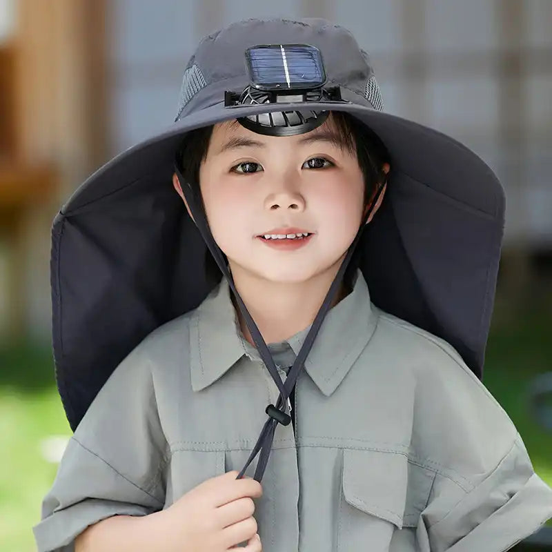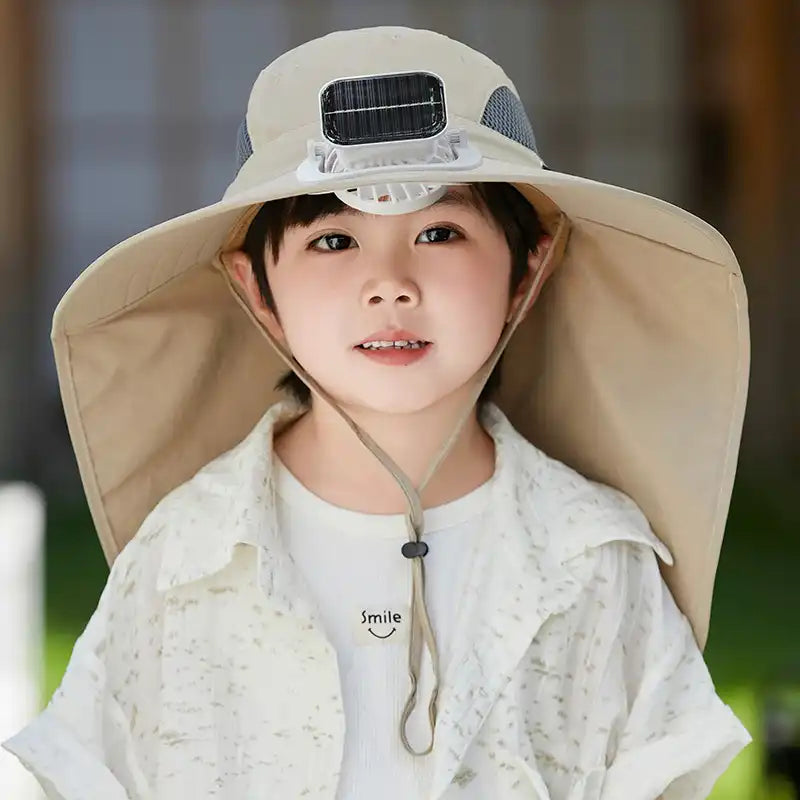 Kids Solar & USB Rechargeable Fan Hat - Wide Brim, Neck Flap, UV Protection, Breathable Outdoor Cooling
