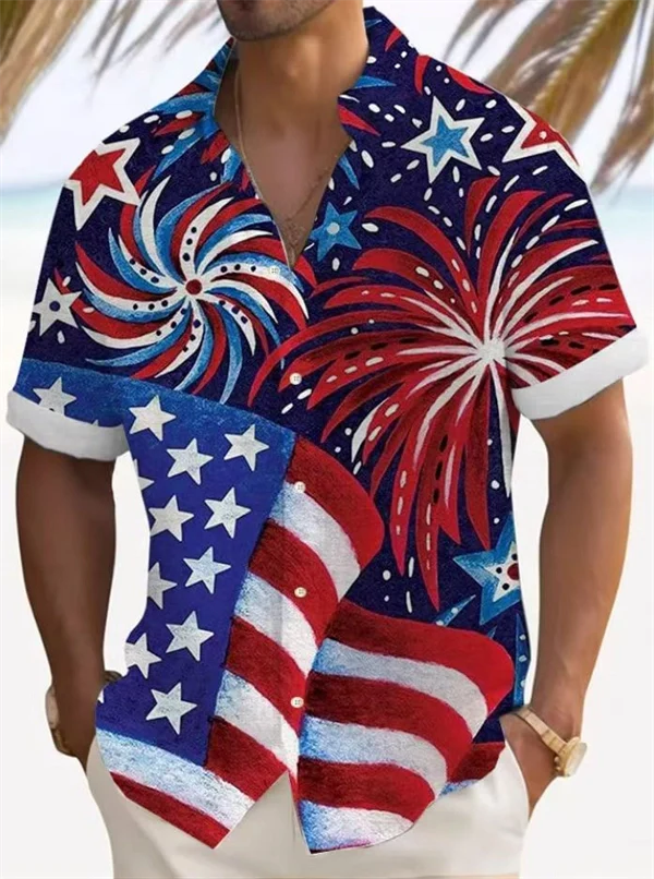 Men’s American Flag Button-Up Shirt – Patriotic Short Sleeve Hawaiian Top for 4th of July