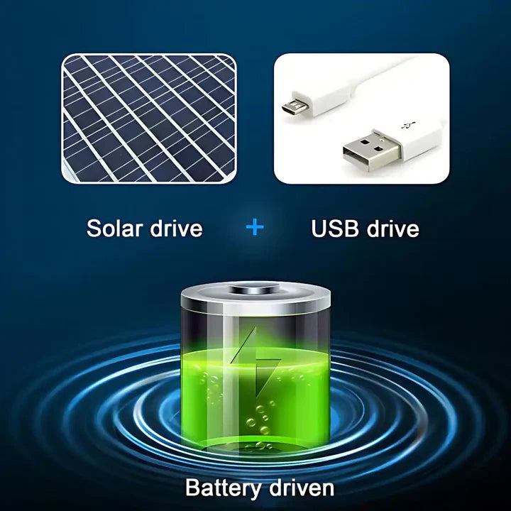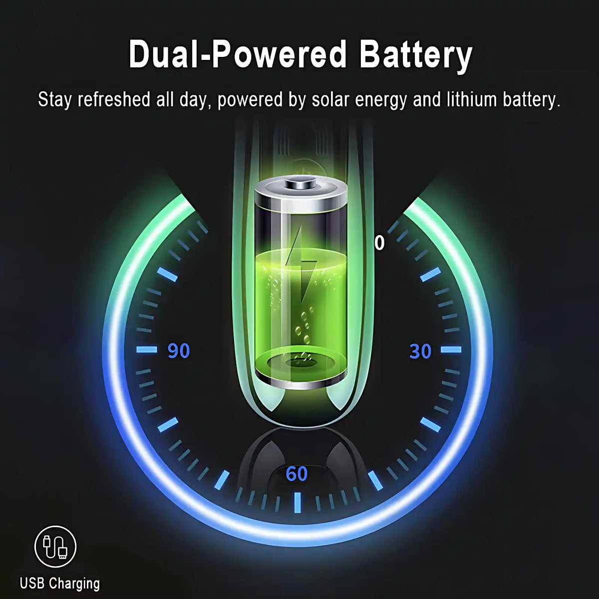 Harness the sun or USB power for on-demand airflow. Solar panels deliver sustainable breeze in direct sunlight, while the 7-hour battery backup (3-speed adjustable) ensures cooling anytime. Switch between solar (SUN) or battery (BAT) mode effortlessly.