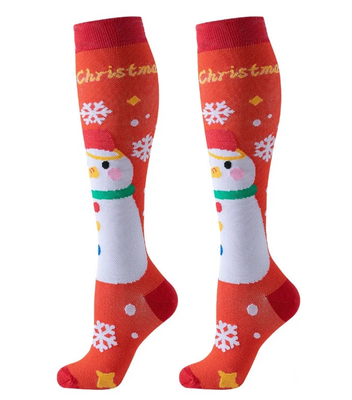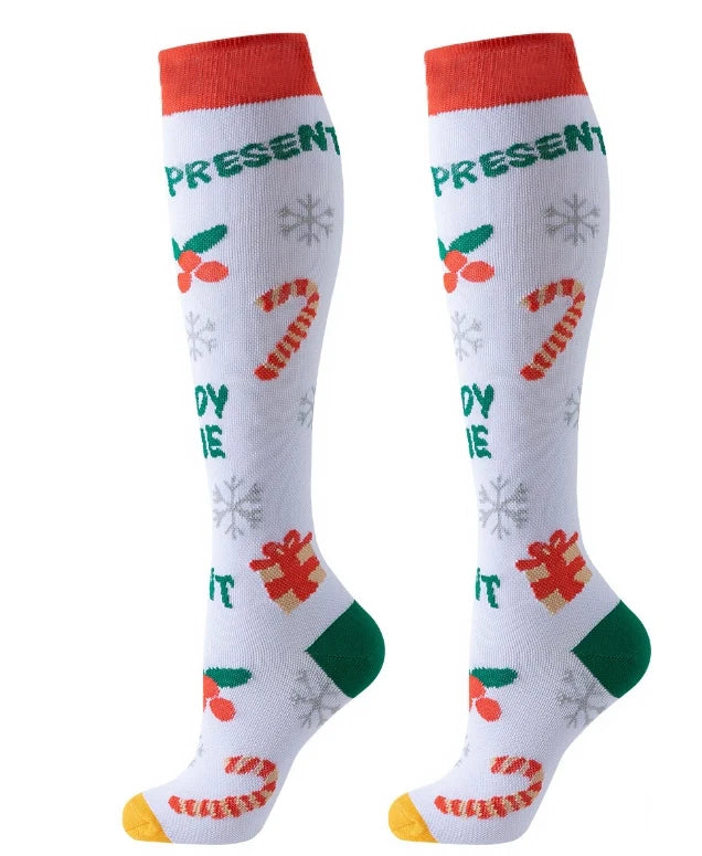 Festive and Fun Designs: Each pair features a unique Christmas-themed pattern, including snowmen, reindeer, Santa Claus, and more, adding holiday cheer to your wardrobe while keeping your legs comfortable and supported.