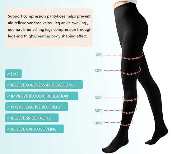 Our compression pantyhose for women assist your heart in circulating the flow of blood and oxygen throughout your body, giving your legs and veins healthy support for pain relief.
