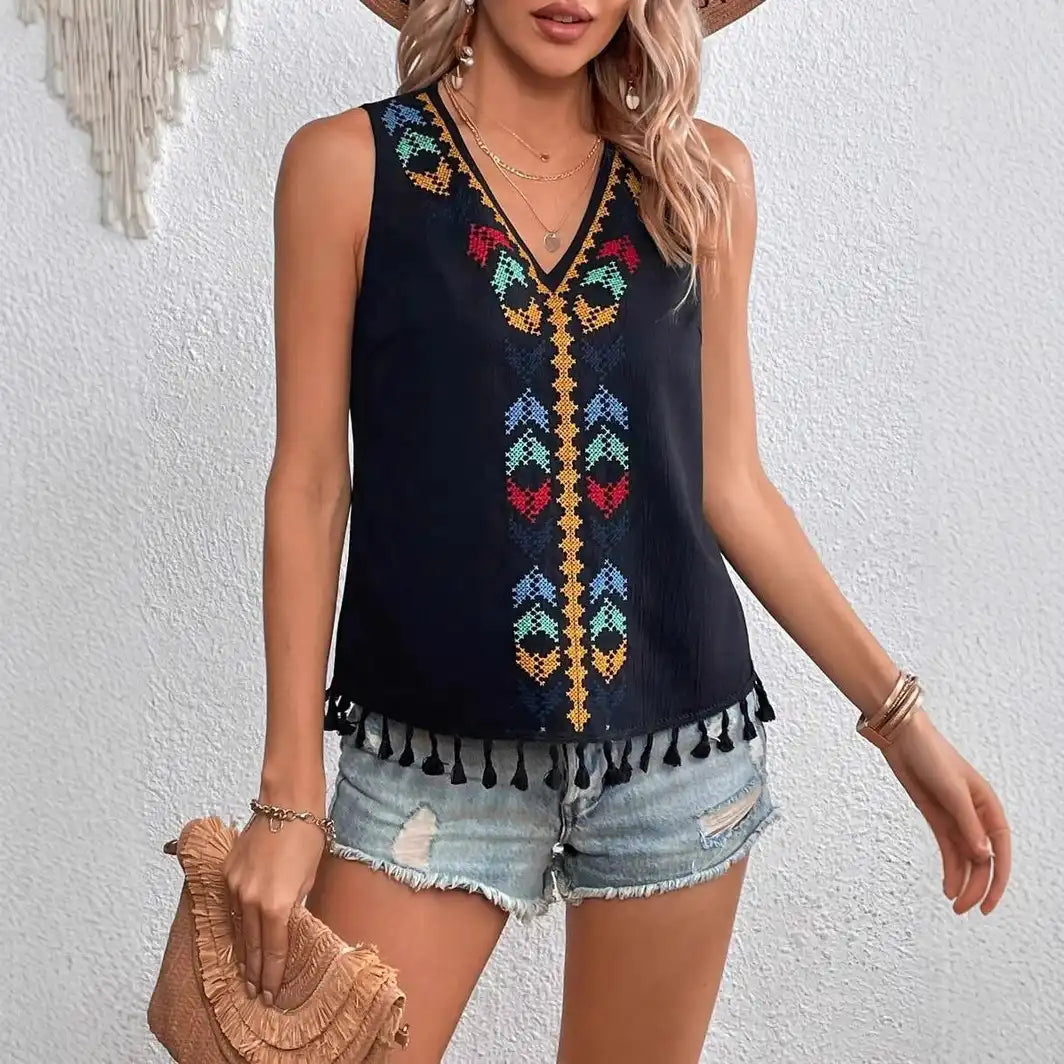 Summer Women's Ethnic Sleeveless V-Neck Vest with Tassel Hem