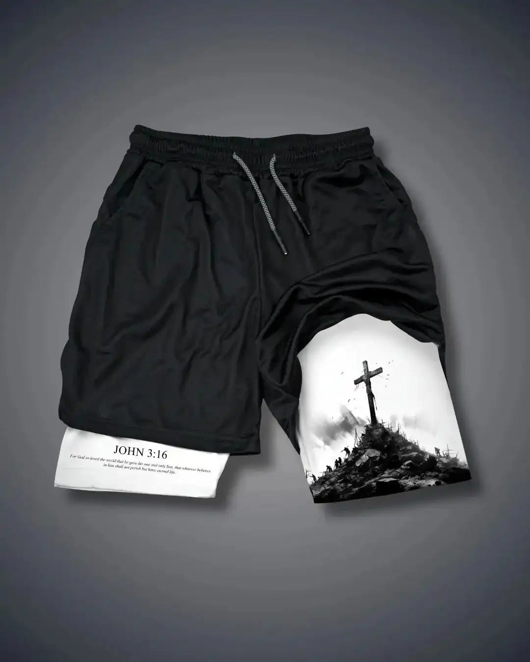 These performance shorts feature the inspiring verse from John 3:16, combining style with functionality to enhance your workout experience.