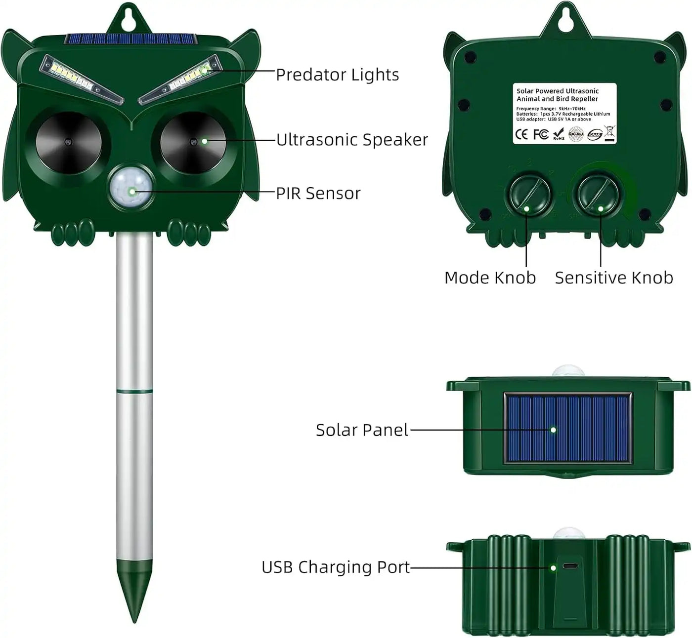 Advanced PIR Motion Sensor: Detects movement within a 26-foot (8-meter) range and a 110° arc, triggering ultrasonic frequencies (13.5–45kHz) to scare off intruders.