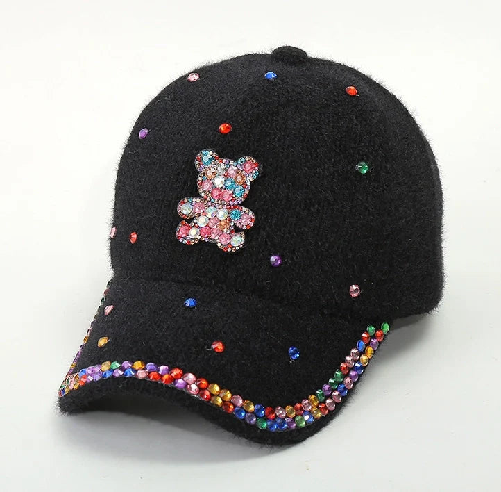 3. Adorable Teddy Bear Accent: Each cap features a charming rhinestone teddy bear patch at the front, offering a fun and whimsical detail to the design.
