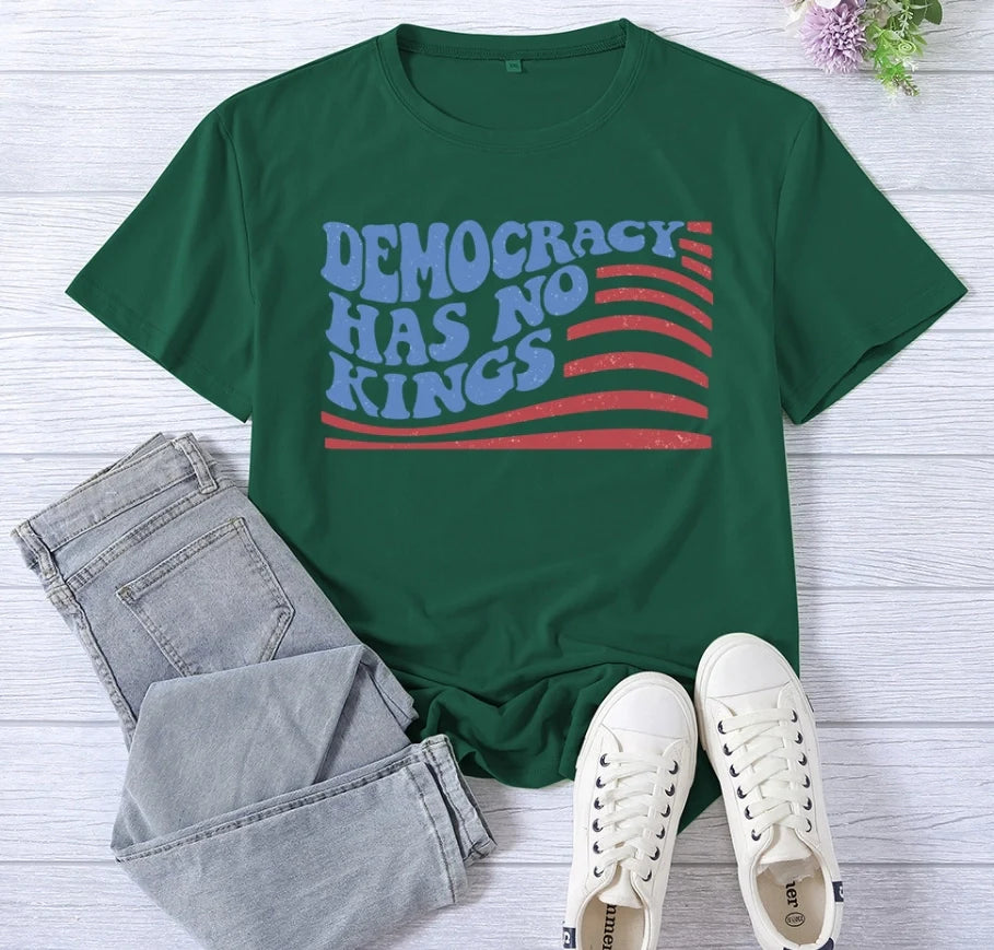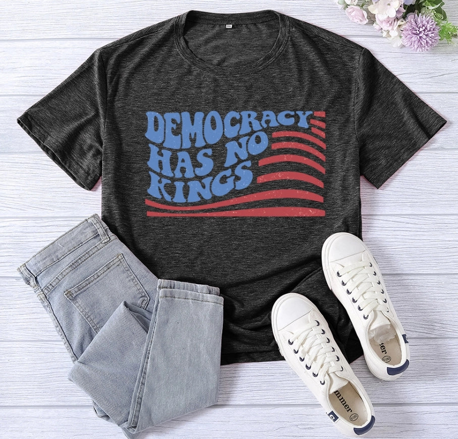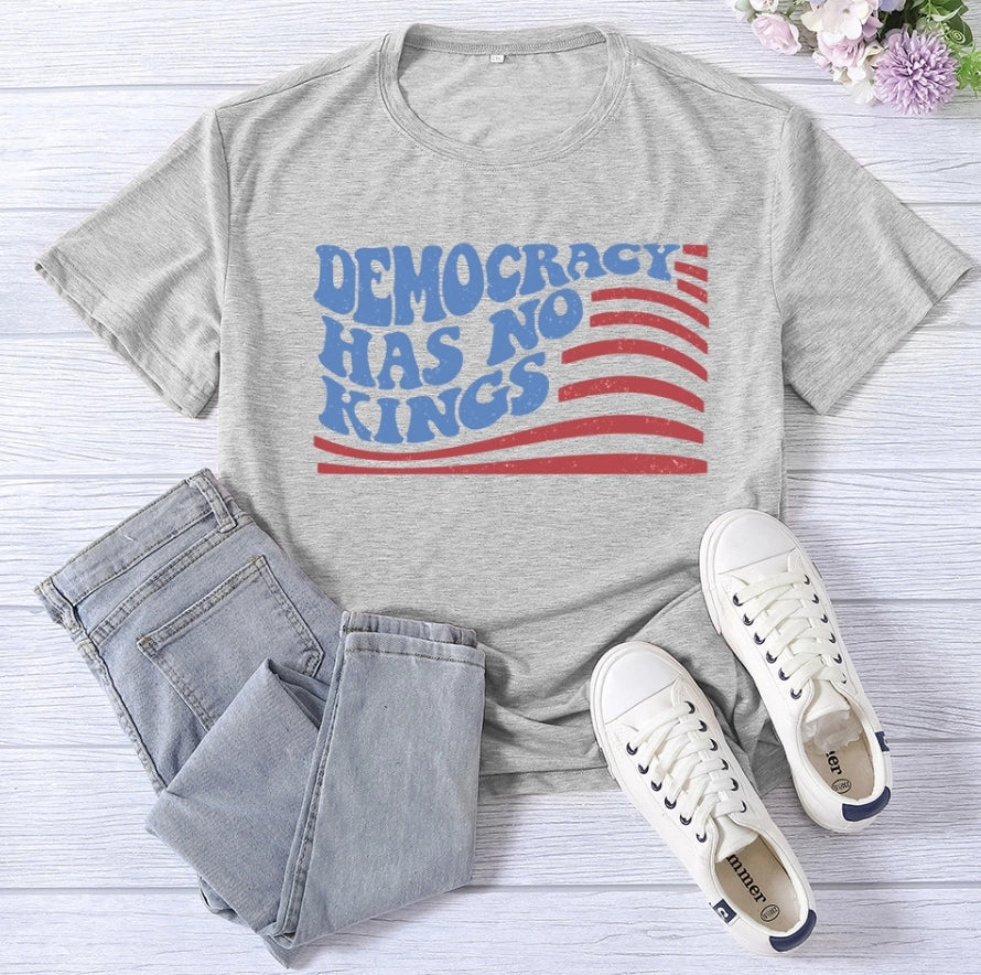 This Women's Crew Neck T - Shirt is a perfect blend of style and statement. Emblazoned with the powerful slogan "Democracy Has No Kings" in a trendy, retro - styled font, it's a nod to democratic values.
