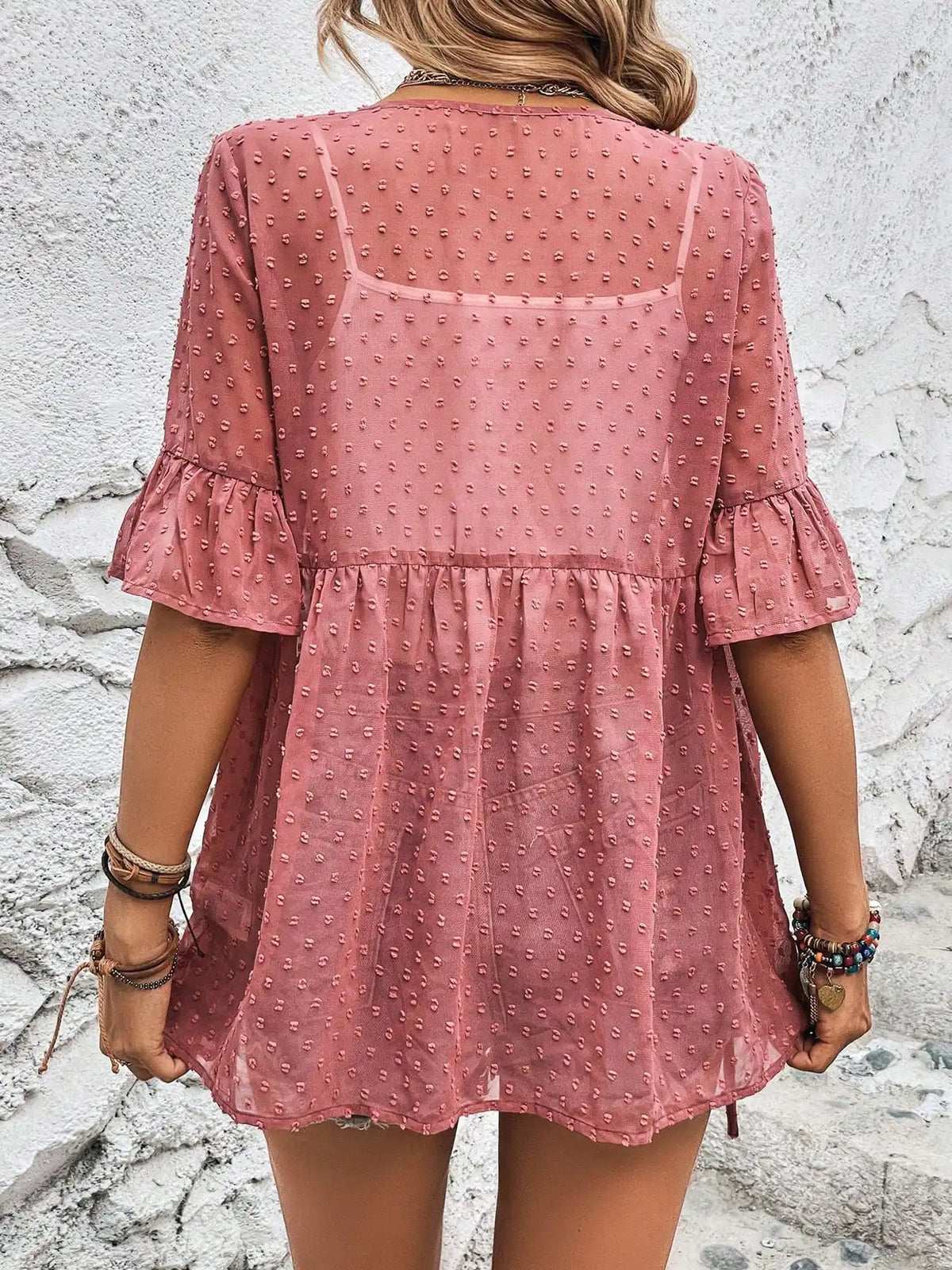 Sheer Chic Design – Delicate Swiss dots, airy chiffon mesh, and loose-fit silhouette add flirty sophistication to any outfit.